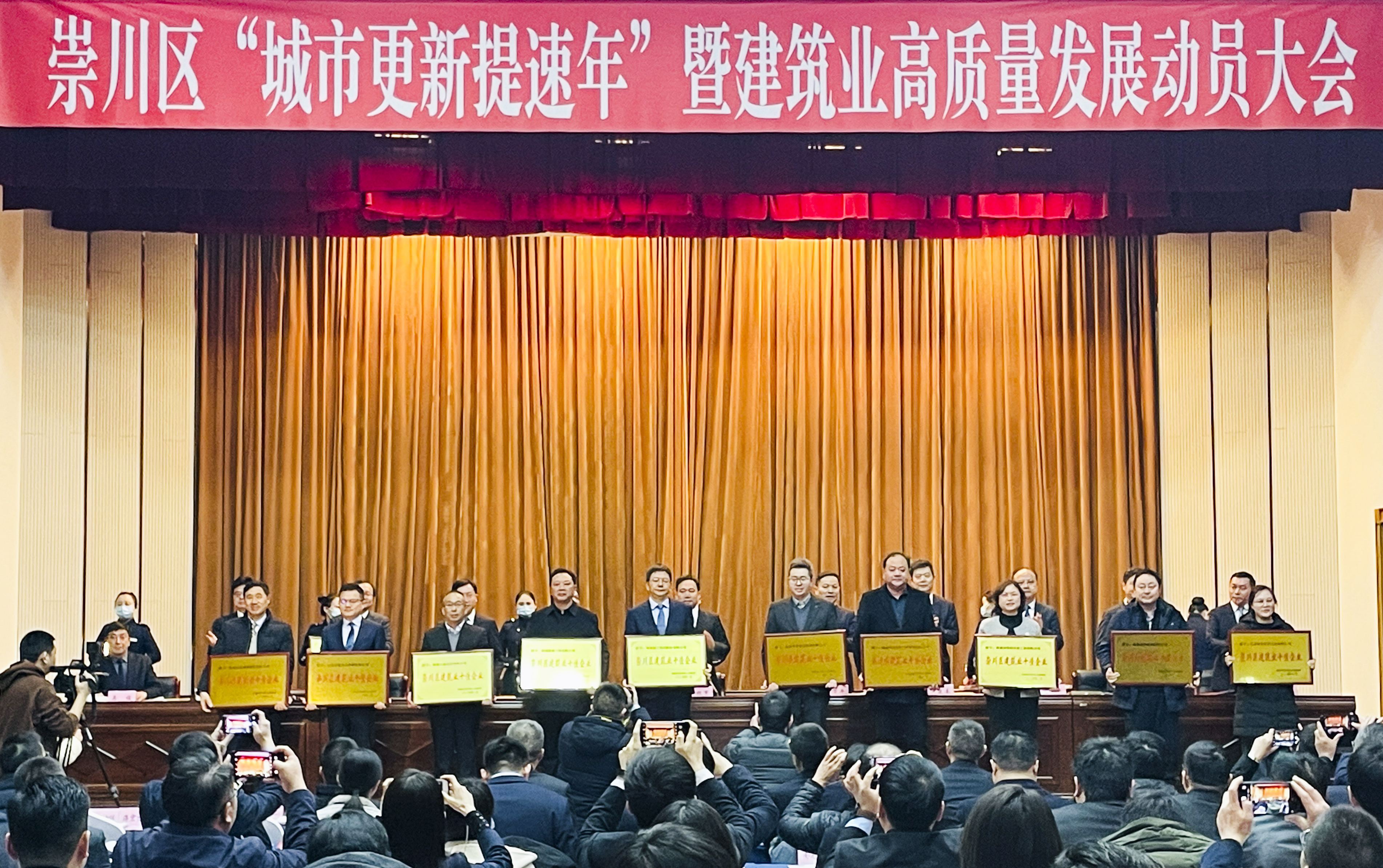 1月27日,崇川区召开“城市更新提速年”暨建筑业高质量发展动员大会,动员全区上下早部署、早行动,高质高效推进城市更新和建筑业发展,为建设实力崇川、美丽崇川提供坚实支撑。区委书记胡拥军出席会议并讲话。区委副书记、区长杨万平主持会议。区人大常委会主任严崇明,区政协主席江建春出席会议,集团公司总经理张忠达出席会议并作交流发言。