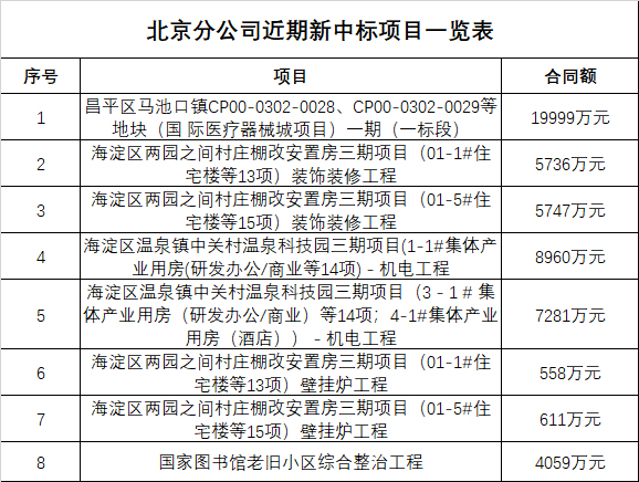 金秋结硕果,奋力正当时。近期,北京分公司在激烈的市场竞争中接连新中标8个项目,中标金额5亿多元。截止10月底,北京分公司今年累计新签合同额超18亿元。