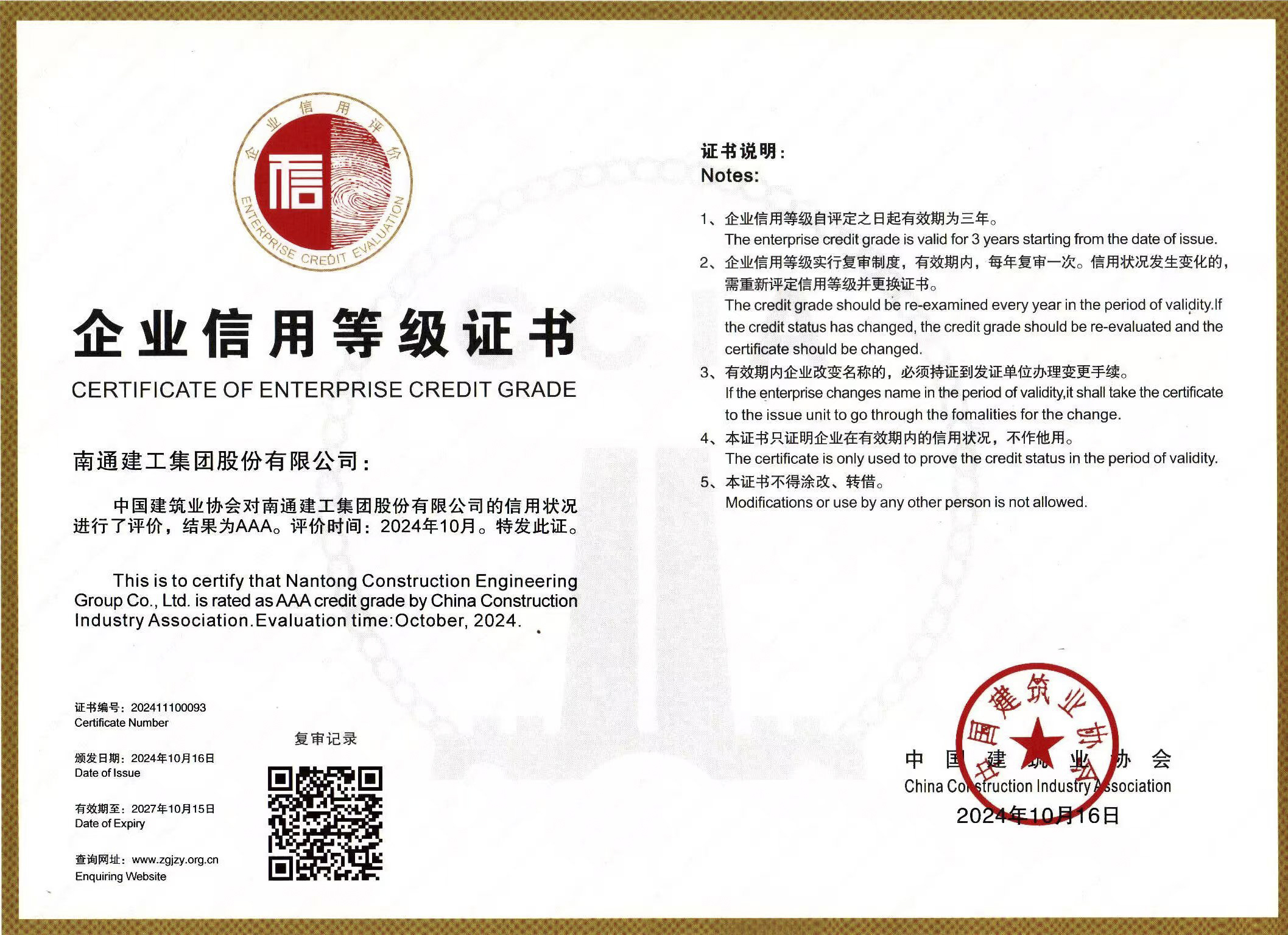 一直以来,南通建工始终积极响应国家关于社会信用体系建设的号召,不断加强制度建设,完善诚信保障体系,强化项目管控,塑造诚信履约形象。AAA级信用评级,标志着公司在企业素质、诚信意识、经营状况、履约能力和社会信誉等方面均达到了行业领先水平。