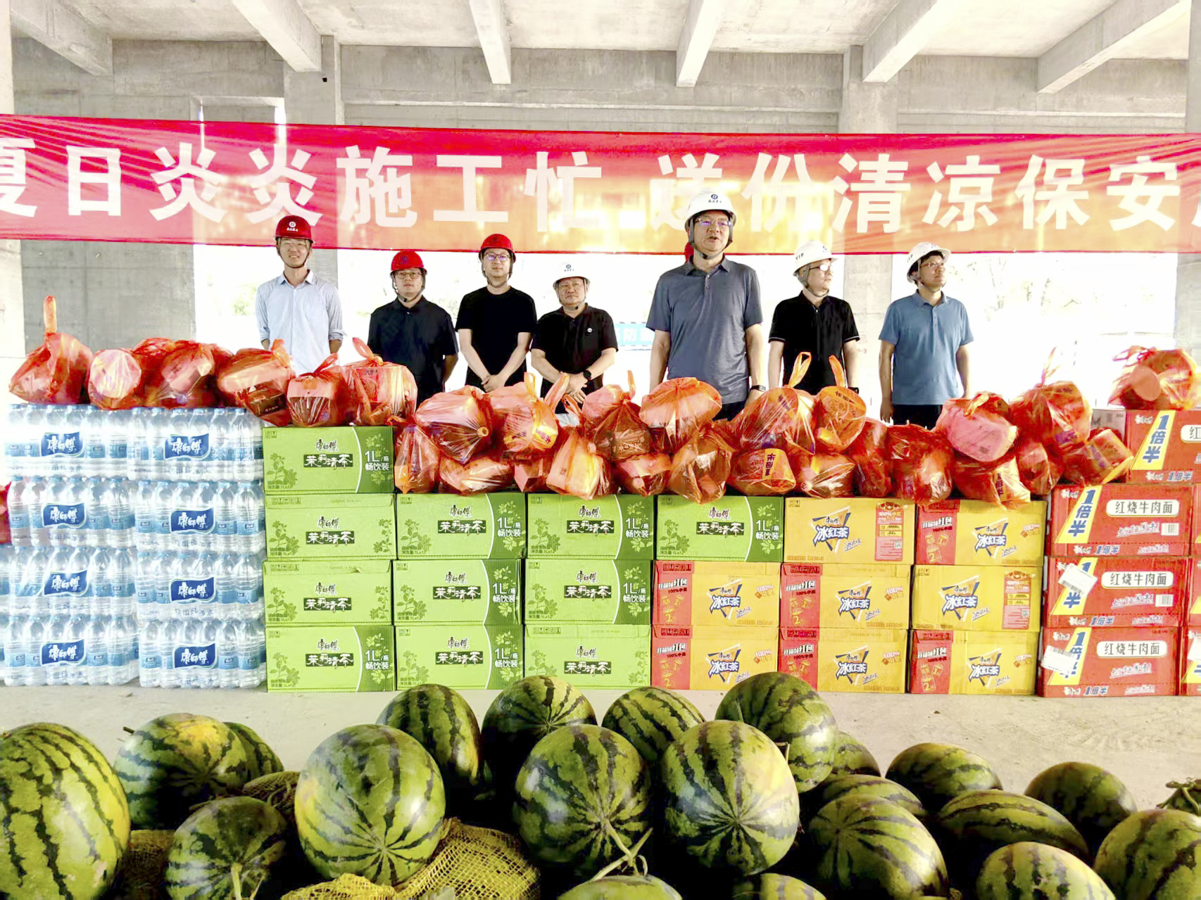 在慰问现场,矿泉水、藿香正气水、清凉油、西瓜、茶等各类防暑降温物资整齐摆放。张忠达总经理亲手将一份份满载心意的清凉物资送到一线作业人员手中,并与大家亲切交谈。“天气炎热,大家一定要注意防暑,保重身体,劳逸结合!”“高温时节,健康是一切奋斗的根基,唯有守护好身体,才能以饱满的状态投入工作”一句句贴心的问候与叮嘱,传递着公司“大家庭”的温暖,让工友们在炎炎烈日下倍感关怀与清凉。