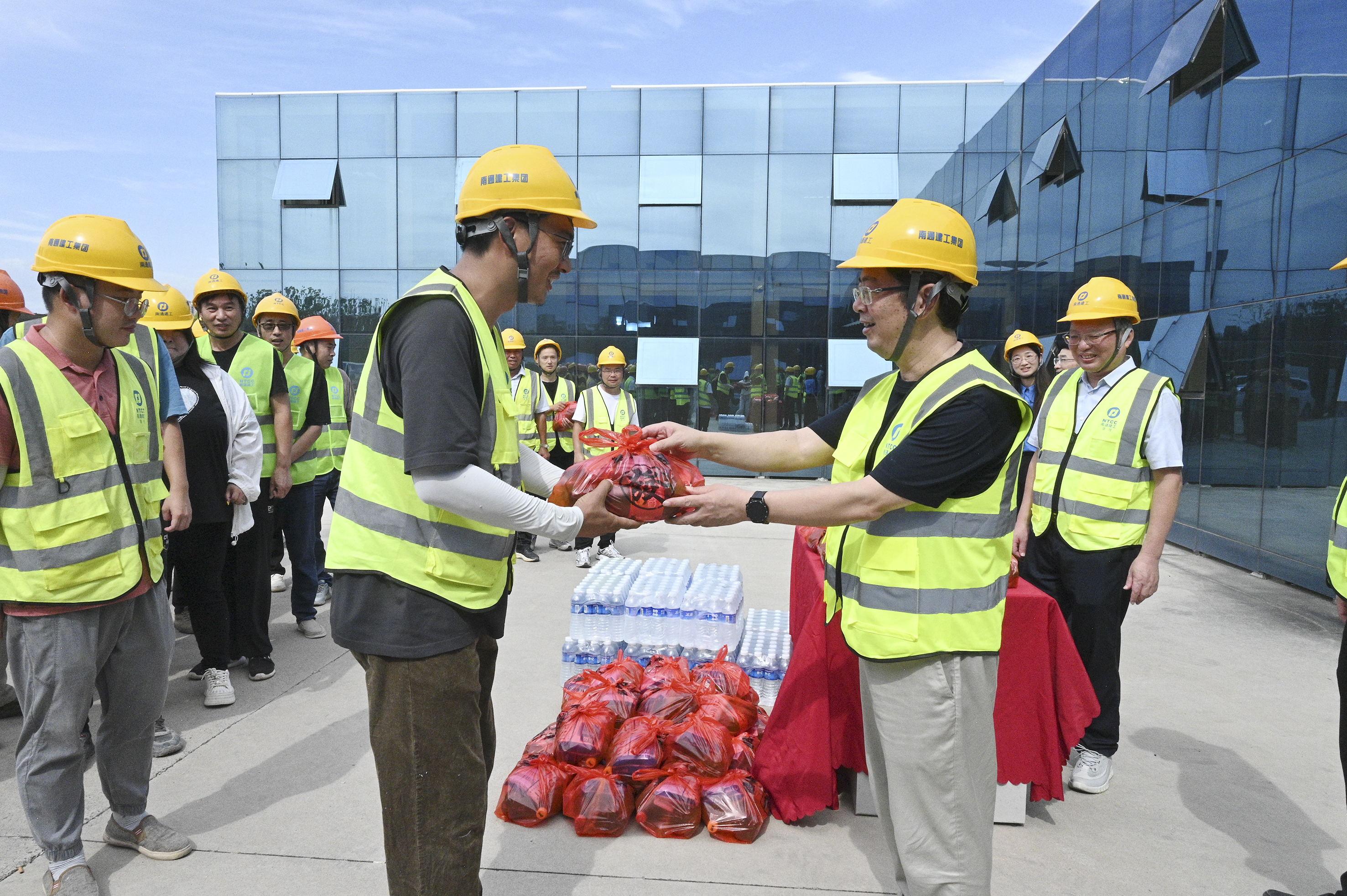 在中创区CR22027地块一期施工总承包项目现场,张向阳董事长将毛巾、饮料、防暑药品等物资逐一发放到职工手中,并与他们亲切交流。“大家辛苦了!高温天气下工作,一定要注意身体,做好防暑措施。”张向阳董事长对职工们在高温环境中坚守岗位、为项目建设付出的努力表示高度赞扬,对他们为公司发展作出的贡献致以诚挚感谢。他反复叮嘱职工们要注重自我保护,合理安排作息,避免中暑和疲劳作业,确保自身安全与健康。