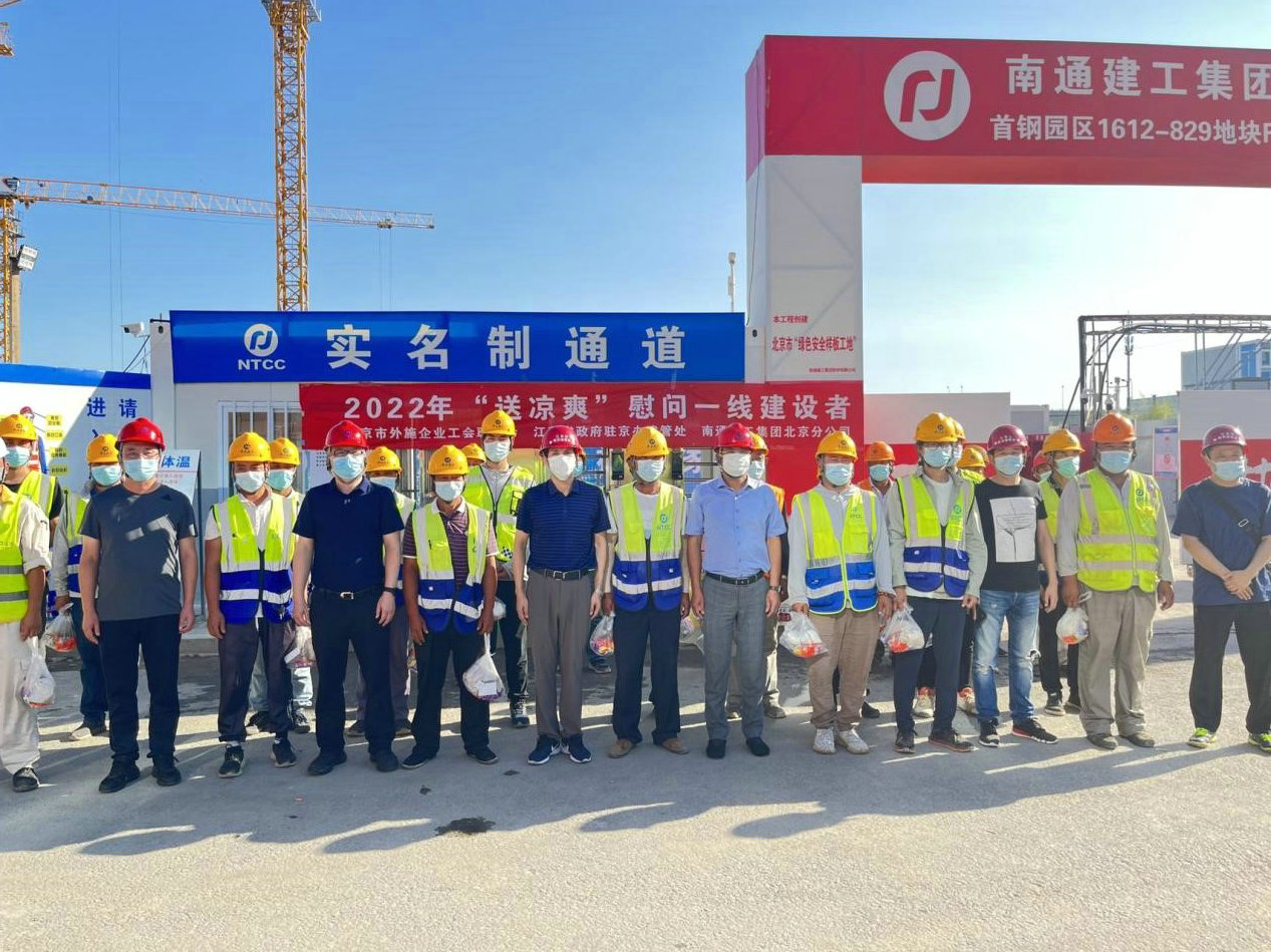 北京市外施企业工会联合会常务副主席、江苏省政府驻京办建管处主任钱明带队深入集团公司施工的石景山区首钢园东南区829地块施工现场,对奋战在一线的建设者们展开慰问,为他们送去冰红茶、绿茶、矿泉水、毛巾、香皂、清凉油等防暑降温物品,并叮嘱大家在高温情况下注意保护自身安全,要求项目部要严格贯彻执行高温防护各项措施,持续做好疫情防控工作,切实维护好一线建设者的合法权益。